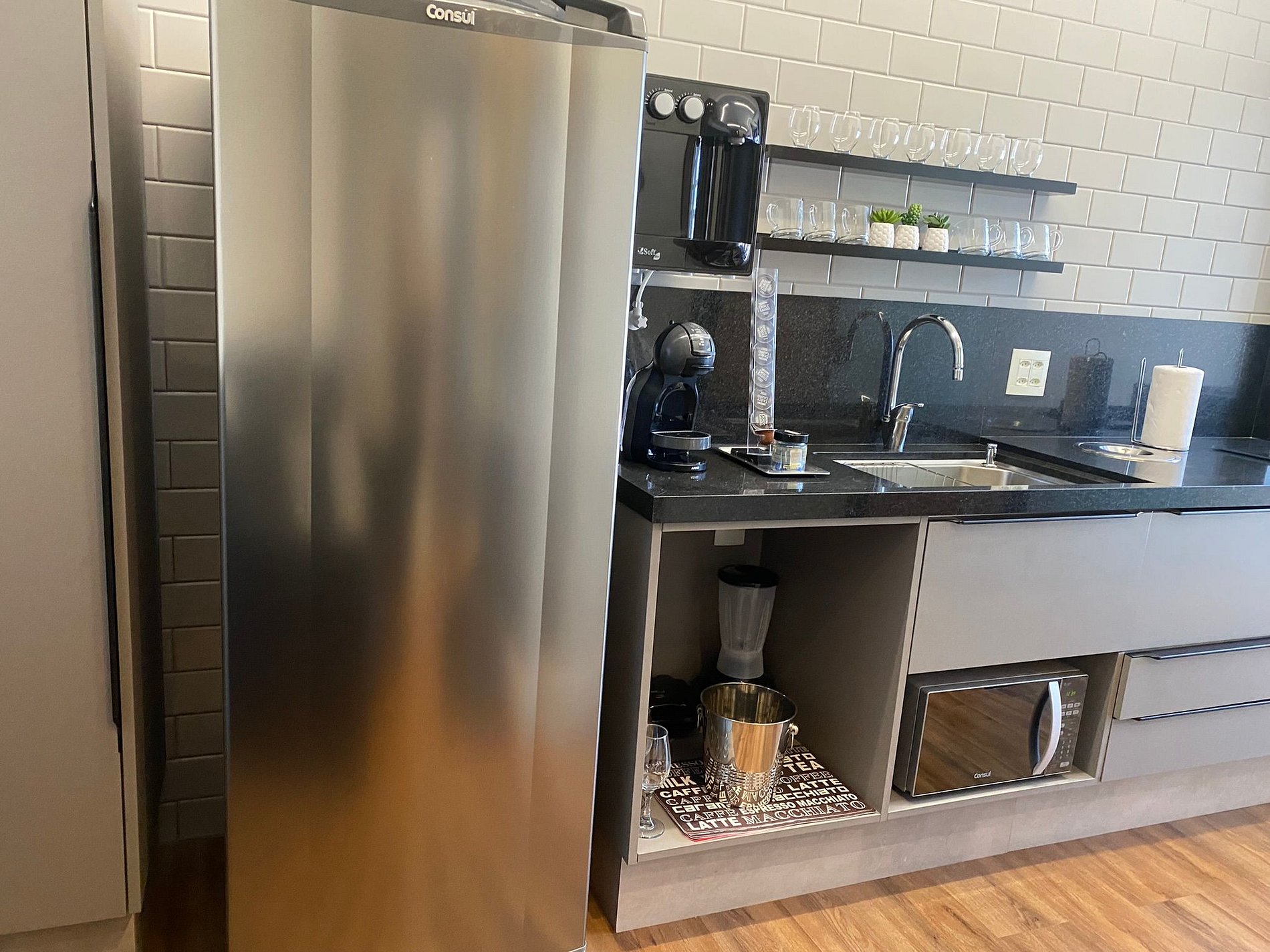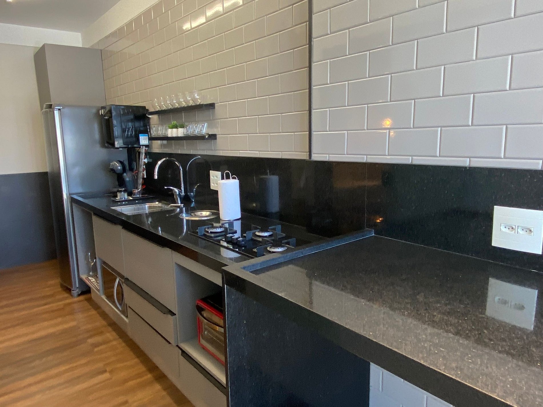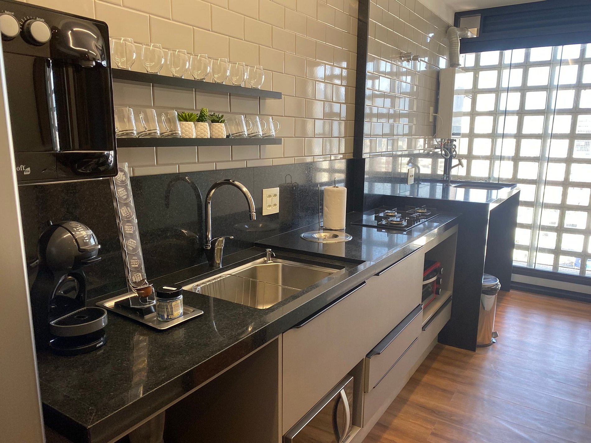 Temos uma máquina de café espresso, e as cápsulas são uma cortesia, esperamos que gostem.