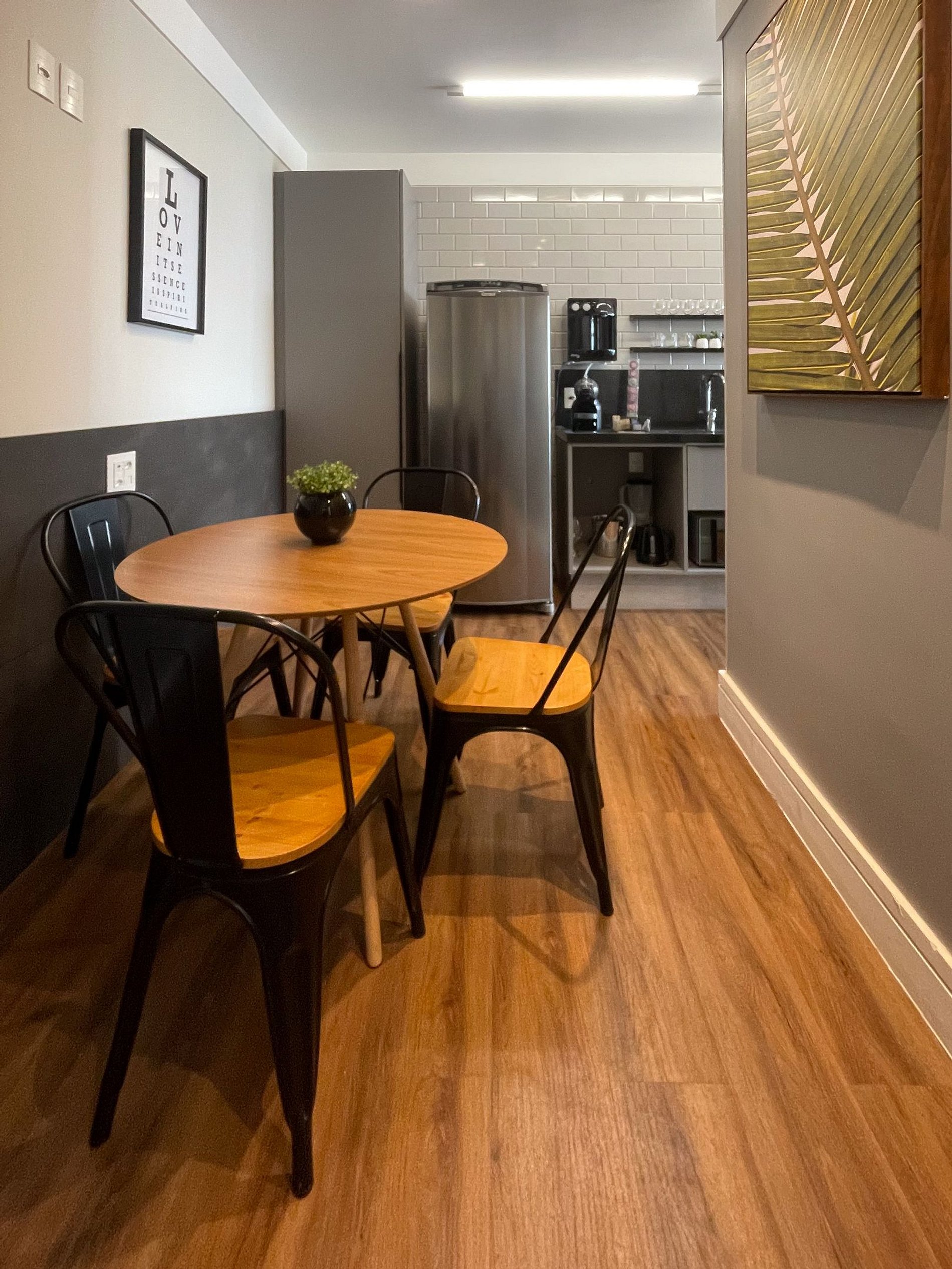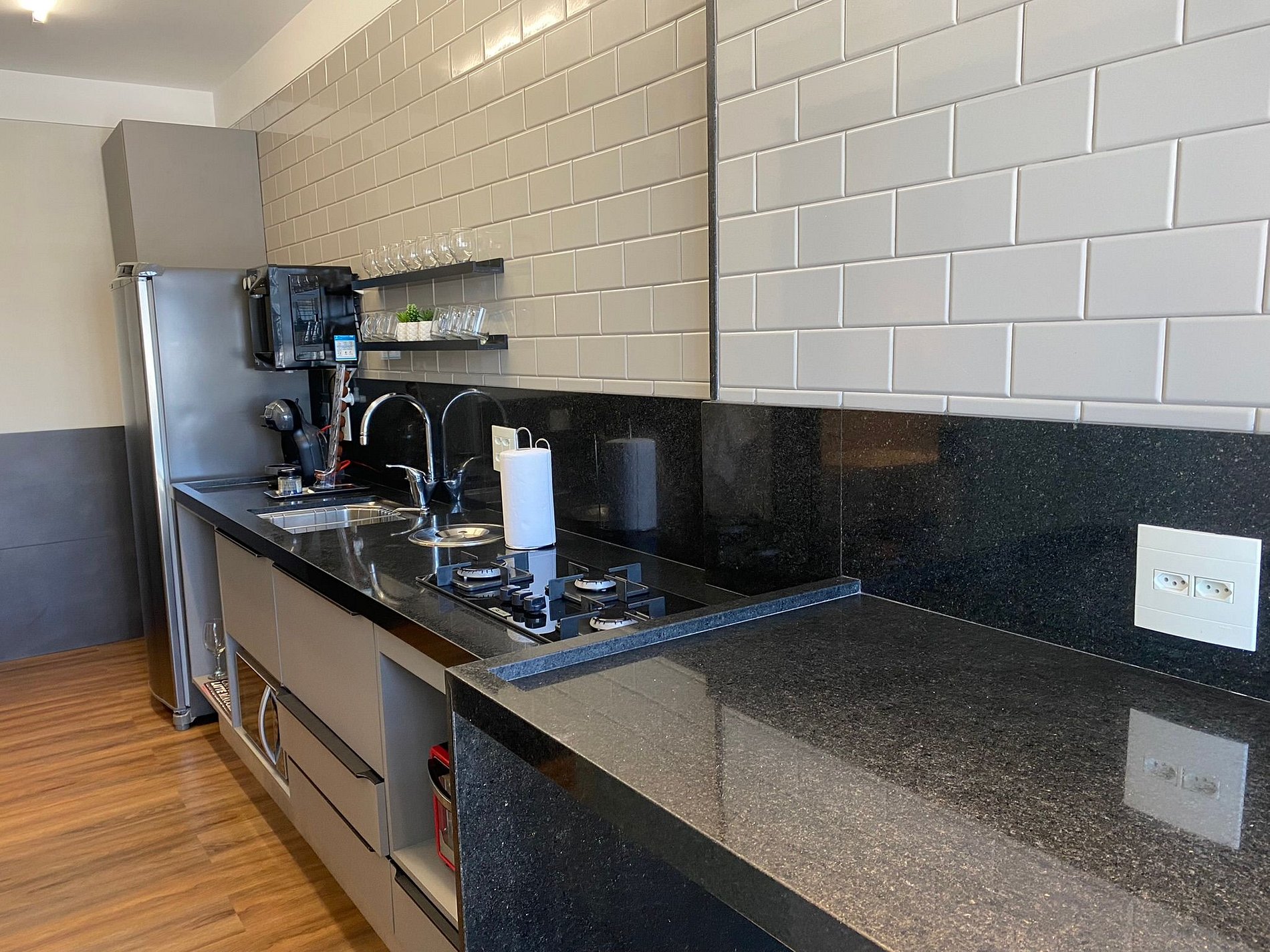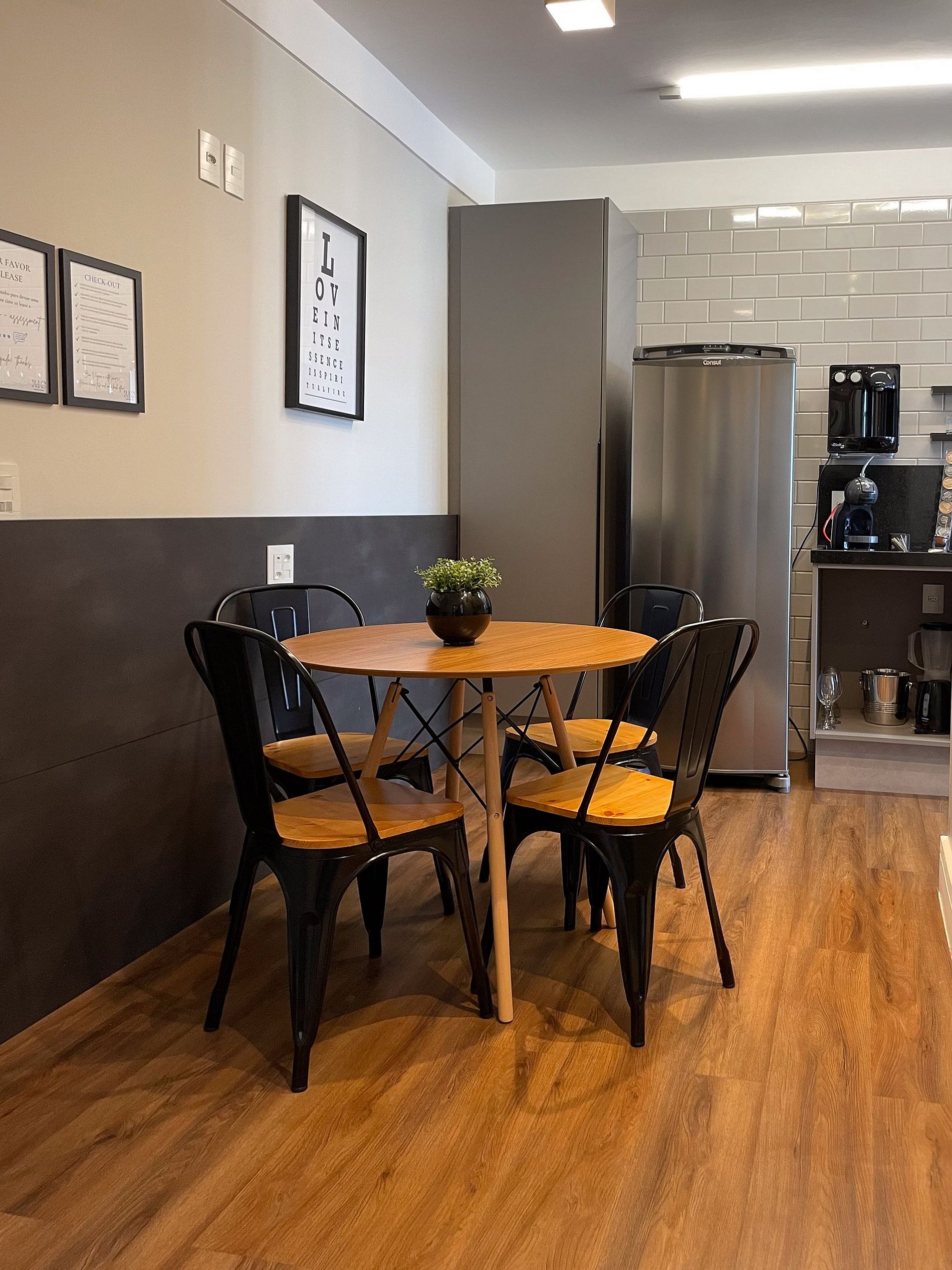 Temos uma máquina de café espresso, e as cápsulas são uma cortesia, esperamos que gostem.