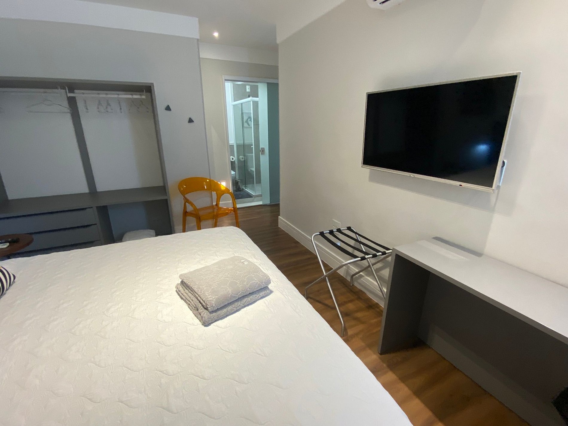 Em uma das suítes acomodamos 4 hóspedes, neste quarto temos uma cama casal king e duas camas auxiliares de solteiro. Na outra suíte temos uma cama casal queen. Além de novos todos os colchões e travesseiros possuem capa de proteção.