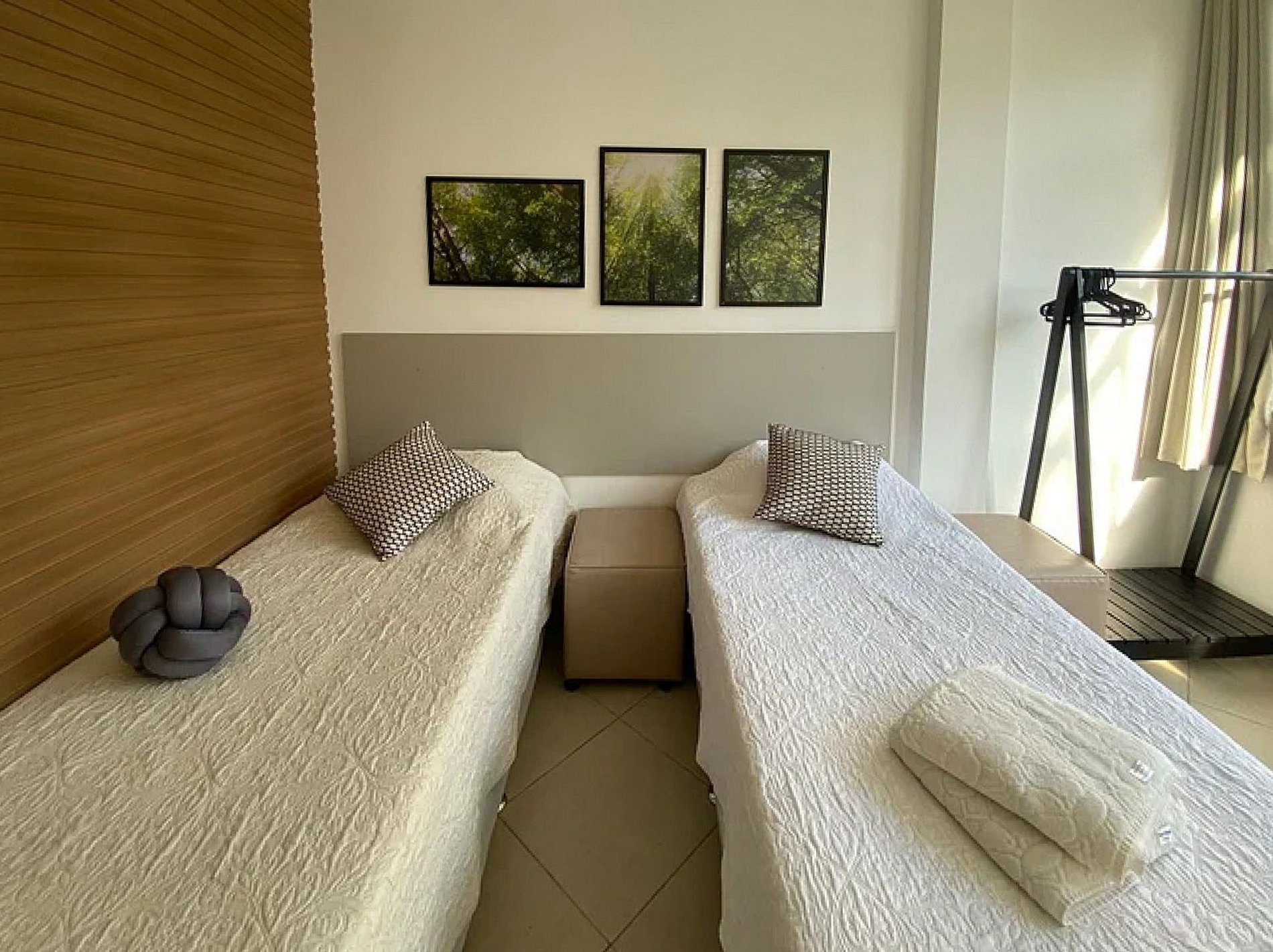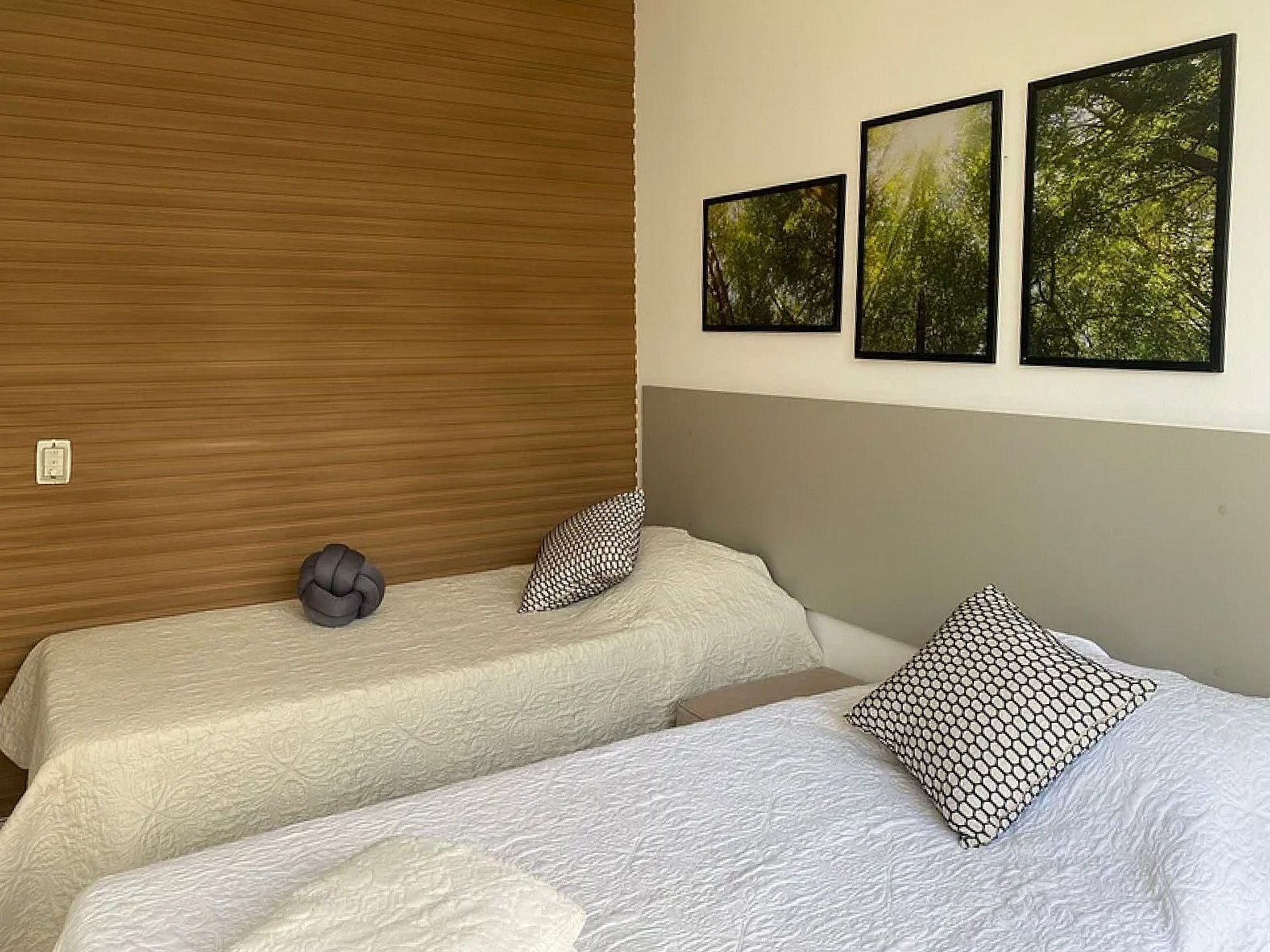 Acomodamos dois hóspedes em cada quarto e temos duas camas auxiliares de solteiro.